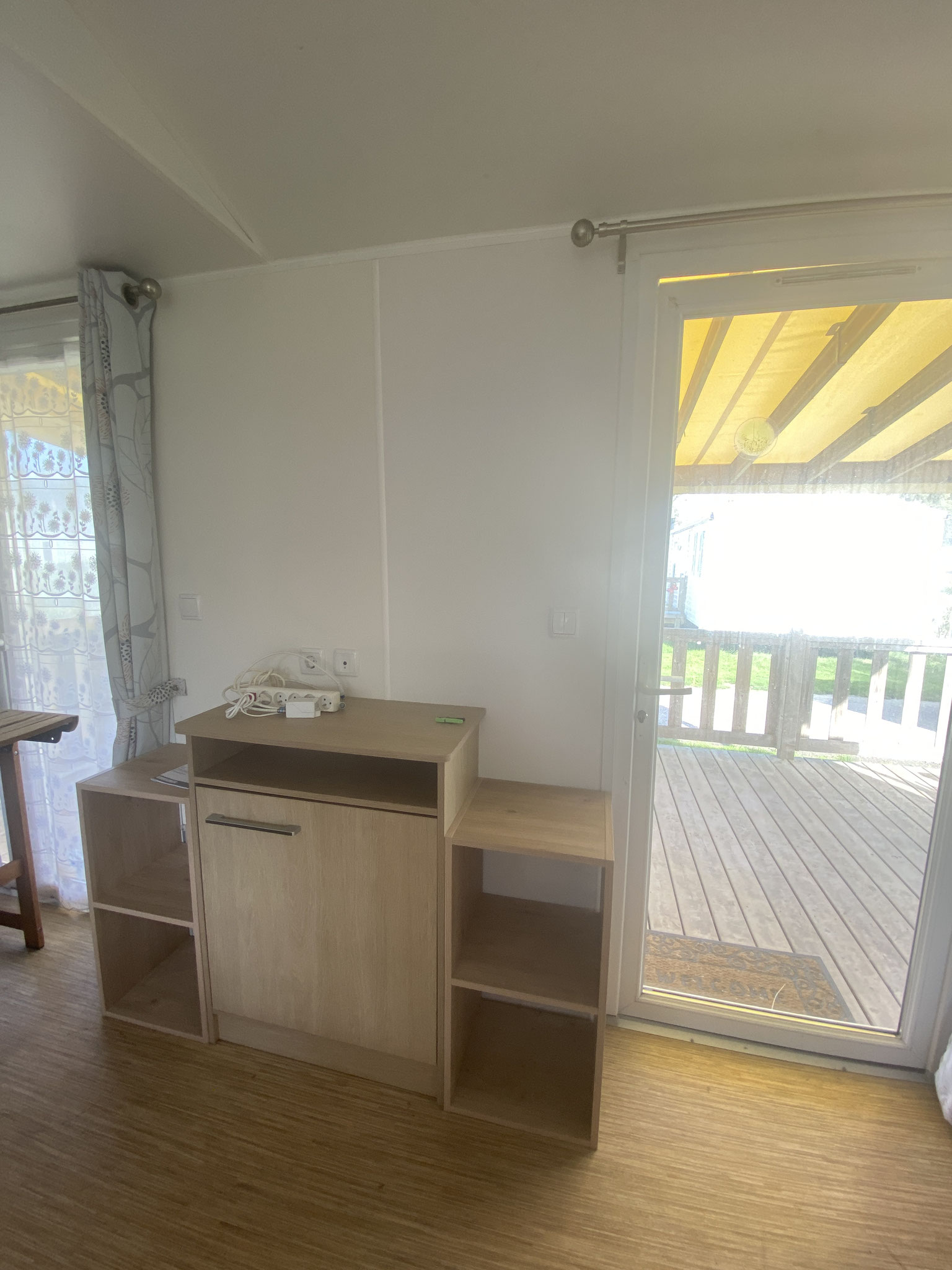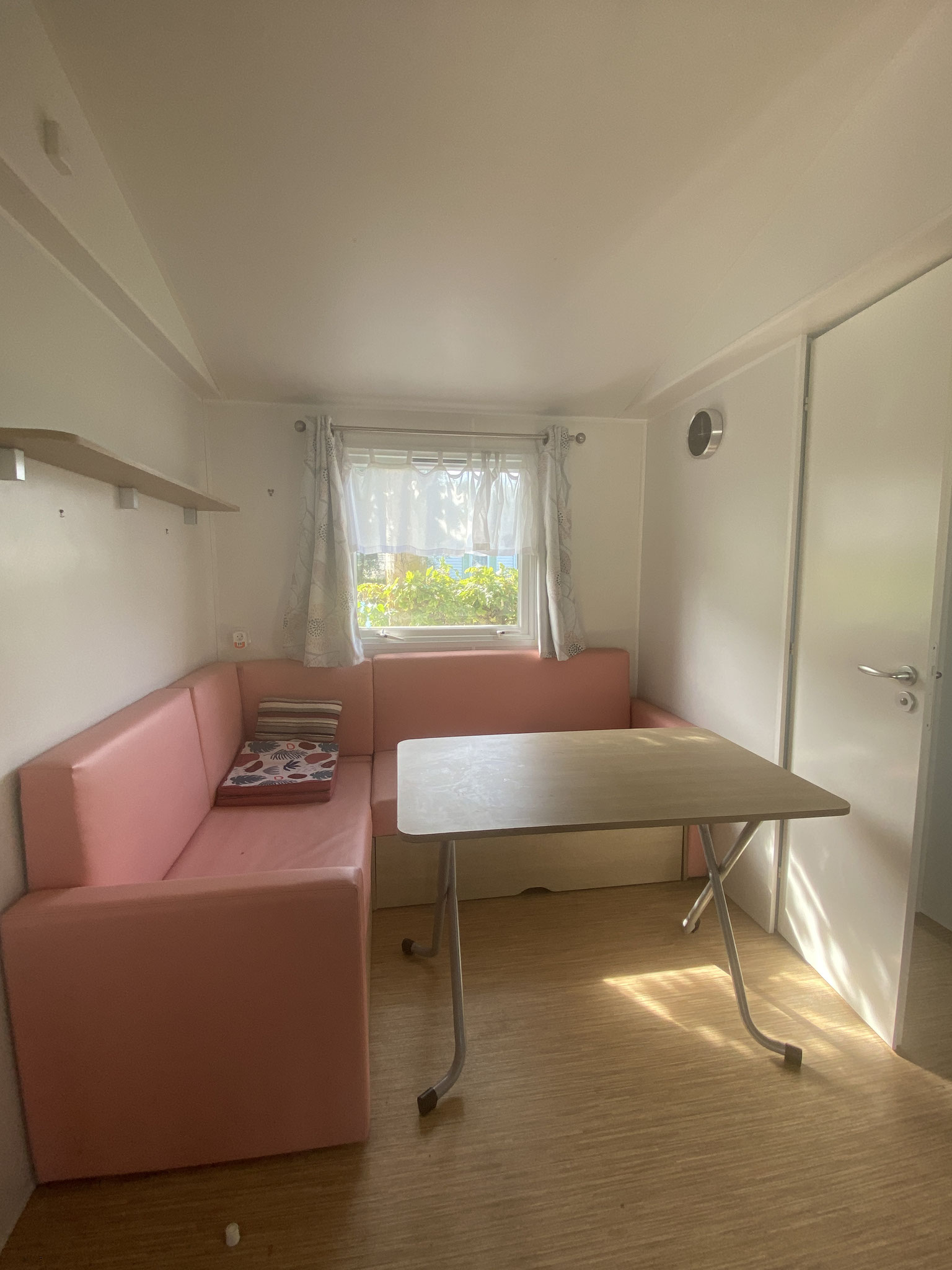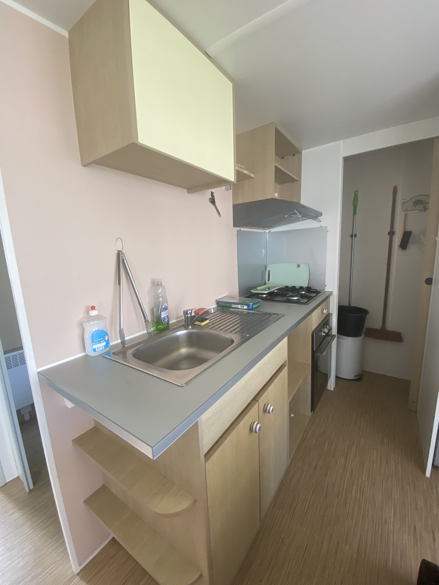 Le mobil home vous propose un coin salon avec un canapé d'angle de 4 places, une table, deux chaises, une cuisine ouverte en longueur avec plaque de cuisson, un four, une hôte aspirante et un frigo.