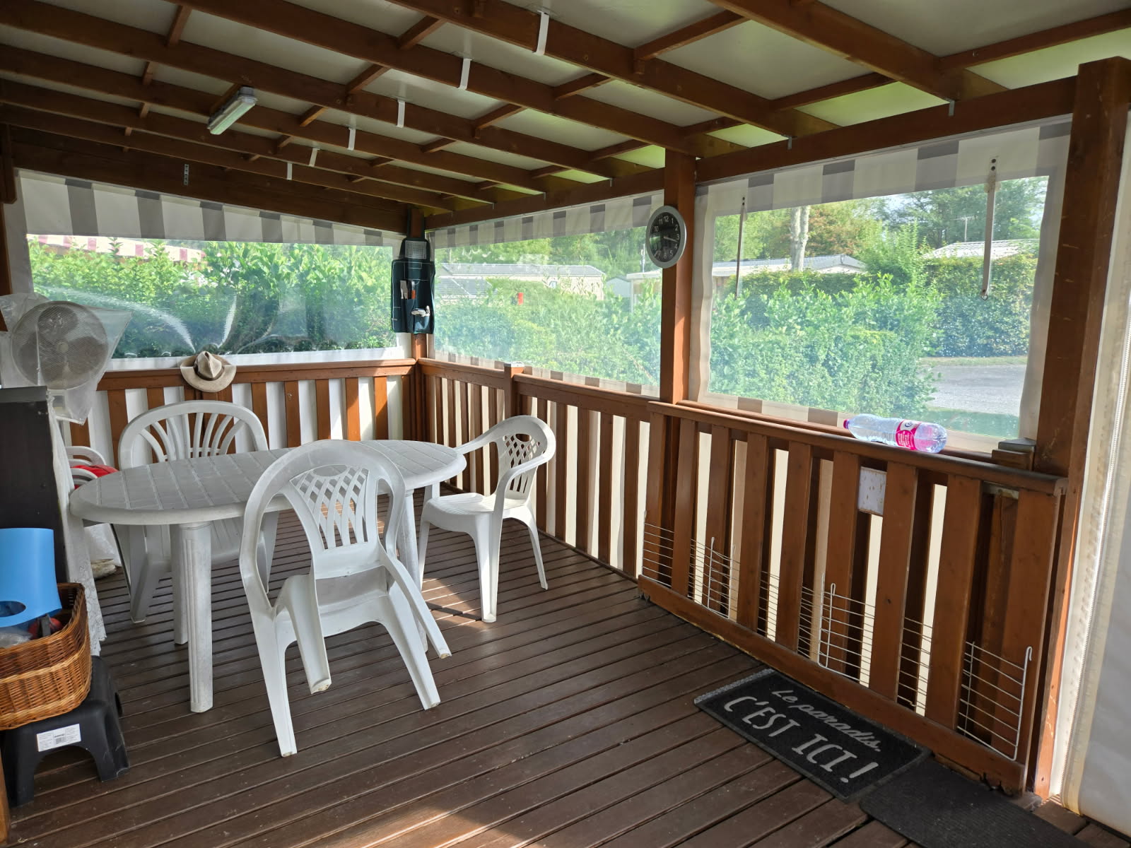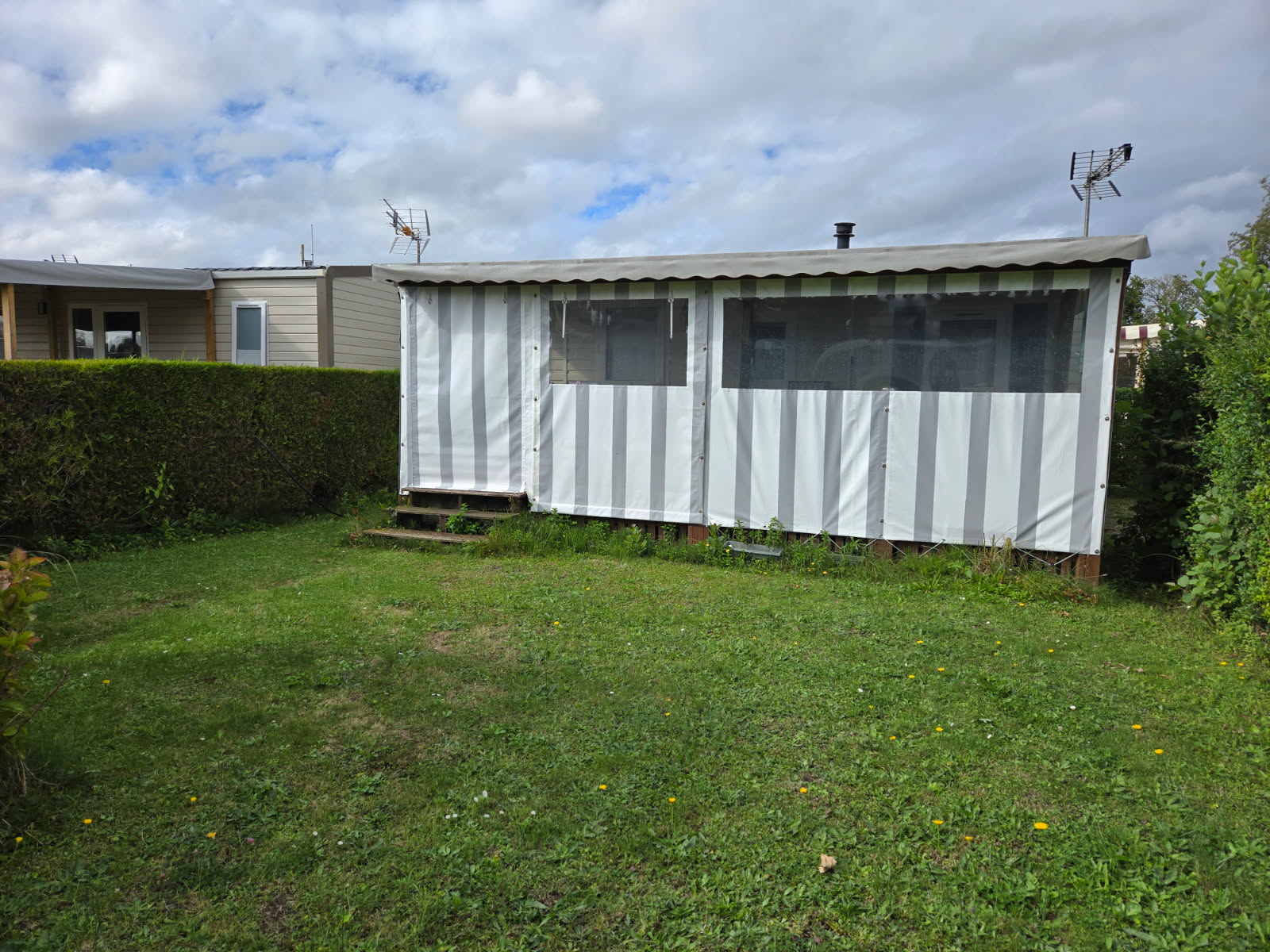 Il est exposé sur un bel emplacement exposé plein Sud d'environ 170 m², vous trouverez également une terrasse entretenu avec les toiles récemment installées (2023) ainsi qu'un chalet de 4 m² environ.